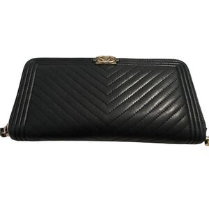 This luxurious clutch features a classic chevron quilting pattern in smooth black leather, accented with gold-tone hardware. Its sleek rectangular design is perfect for carrying essentials, making it a timeless accessory for any occasion.