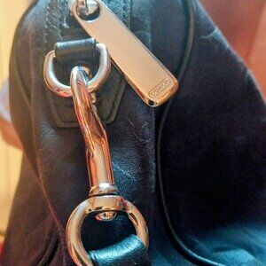 The Coach Taylor OP Art Satchel Handbag in black is a stylish and versatile accessory for women in excellent condition both inside and out. With a rectangular shape and double handles, this medium-sized bag features a zip closure, silver hardware accents, and inner pockets for organization. Made from a combination of fabric and leather, this satchel/top handle bag is perfect for casual or business occasions, and comes with a detachable strap and bag charm for added flair. The Coach Taylor design showcases a logo pattern and a unique art theme, making it a standout piece in any outfit.