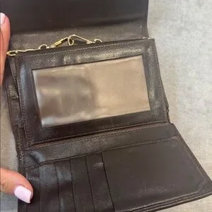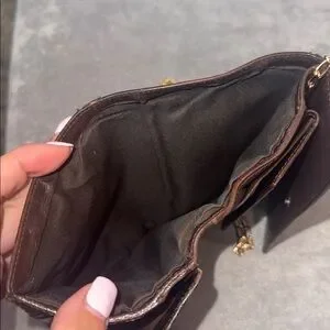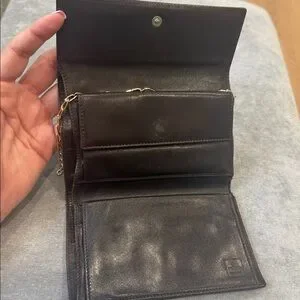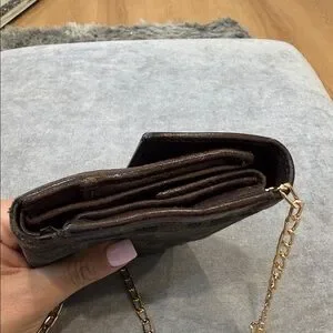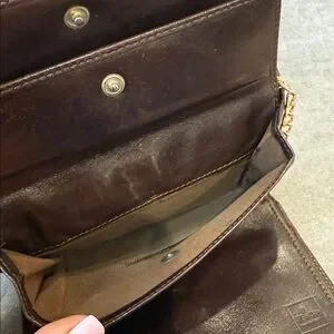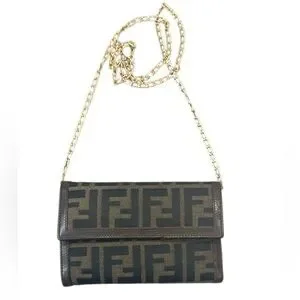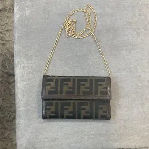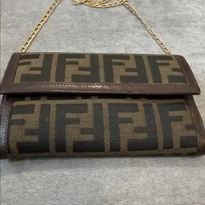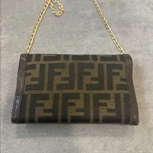 Stylish Fendi clutch with iconic monogram. Features a luxurious gold chain strap. Perfect for any occasion.