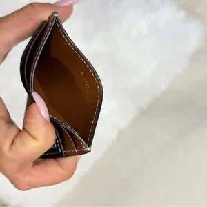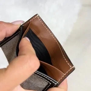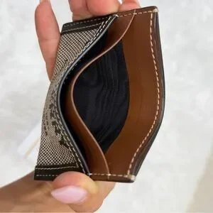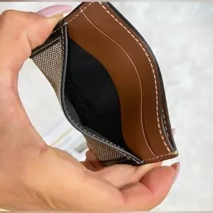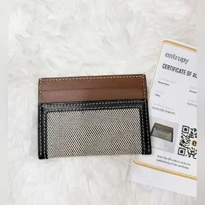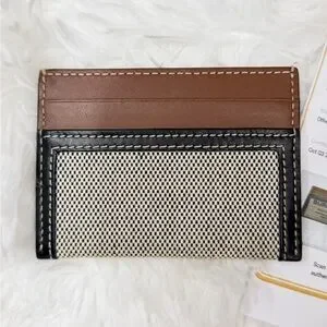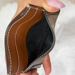 Stylish Burberry card holder. Features tan and black design. Perfect for essentials.