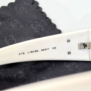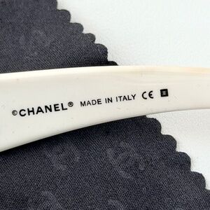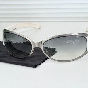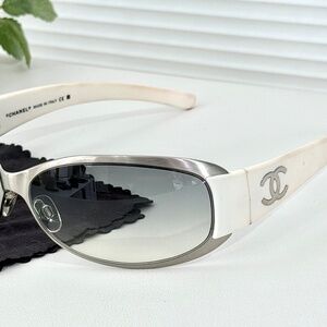 Authentic Chanel 4116 sunglasses in rare ivory-white with brushed silver metal accents and oversized CC logos on each arm. Designed with a sleek wrap-around silhouette, gradient gray lenses, and signature Chanel craftsmanship — a timeless early-2000s collector style. Made in Italy around the mid-2000s. They feature the classic interlocking CC logo on wide ivory-toned acetate arms with brushed silver-tone metal front trim and gradient gray lenses — a style that was part of Chanel’s luxe “Logo Collection” during that era. Purchased myself at the Chanel store. No receipts just original case and cleaning cloth with CC logos.
