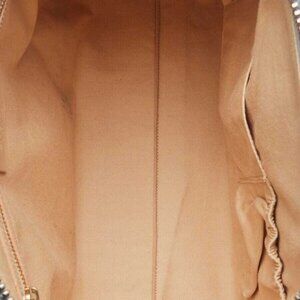 The exterior leather is clean but has some rubbing and light wear to the bottom corners and the base. The handles have rubbing and soiling to the undersides. The shoulder strap is clean with light creasing. The silvertone hardware has surface scratches but is bright and crisp overall. The interior lining has some staining and soiling but remains in good condition otherwise.
