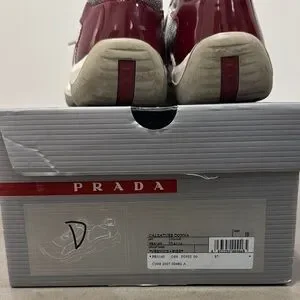 Chic Prada sneakers in fuschia/red and gray. Very well maintained vintage patent leather prada sneakers, barely worn, roughly 15-20 years old and preserved. Rare find.