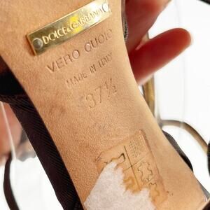 Elegant Vintage Dolce & Gabbana sandals featuring a sultry leopard print fabric upper with delicate grosgrain trim and a romantic floral rosette accent. T-strap silhouette with slim ankle buckle closure and sleek peep toe. Leather insoles and outsole with graceful high heel for a refined finish.