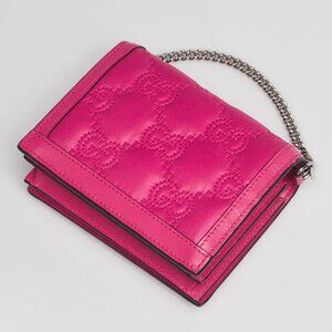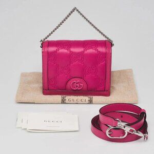 Description This gorgeous and softly structured Gucci Quilted Nylon and Leather GG Mini Wallet on Chain Bag is an ideal accessory! This particular bag features signature stitched nylon with interlocking G logos. The long strap and chain strap allows you to carry this bag crossbody or in the crook over your arm. You will love this timeless piece from Gucci! Condition The leather and nylon are both clean with no wear. The hardware remains bright and crisp. The shoulder strap is clean and the interior is blemish free. Details Overall Condition: New Exterior Condition: New Interior Condition: New Includes: Gucci dust bag, booklets, detachable chain and leather straps Material: Fuchsia Quilted Nylon and Leather Handles: Single flat detachable adjustable leather shoulder strap and detachable chain strap Closure/Opening: Flap top with magnetic snap closure Interior Lining: Fine textile lining Interior Pockets: Two compartments, two card slots Hardware: Silvertone Origin: Italy Production Year: Handle Drop: 2" and 23.5" adjustable Measurements: 5" L x 2" W x 4" H Date/Authenticity Code: 723777-2184