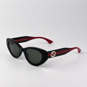 Bold, feminine, and unmistakably Gucci — the GG1862S 001 sunglasses feature a sleek cat-eye silhouette crafted from eco-conscious recycled acetate. A timeless black frame is accented with Gucci’s signature green-red detailing for a subtle pop of heritage color, while grey nylon lenses provide full UV protection and chic everyday wearability.