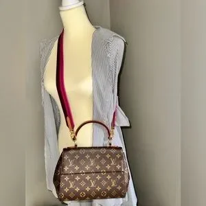This is an authentic LOUIS VUITTON Monogram Cluny BB in Bordeaux and Fuchsia. Used good condition, This handbag is crafted of monogram dark brown coated toile canvas. The bag features a vachetta top handle, detachable two-toned pink shoulder strap, and gold-toned hardware. The front flap opens to a pink fabric interior with patch pockets and a zipper compartment.
