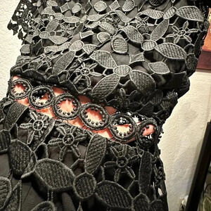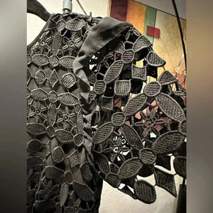 Designed in a versatile shift silhouette, this charming little black dress will flatter any figure and feels effortless to wear. The streamlined silhouette is crafted from delicate lace cut with a mix of geometric and floral shapes and features a round neck, short sleeves and a concealed rear zip fastening. Notice the alluring cutout detailing thoughtfully balanced with a tonal lining to temper the sheerness