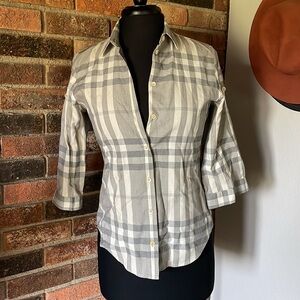 Stylish Burberry button down shirt. Features classic plaid pattern. Three-quarter sleeves. Perfect for casual or formal wear.