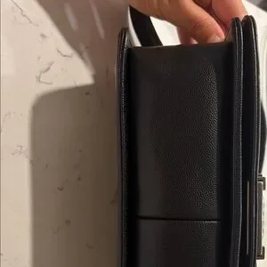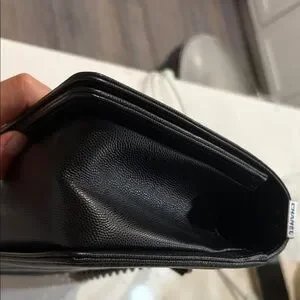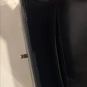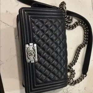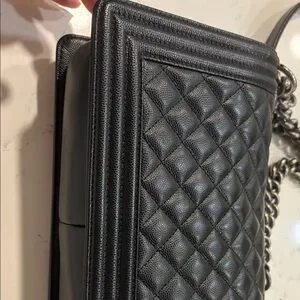 CHANEL leboys bag in black quilted leather. Features a striking silver chain strap and iconic clasp.very good condition.