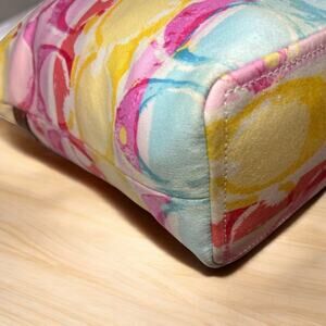 This Y2K Coach 11755 Hamptons Weekend Signature Watercolor Small Tote and Wristlet from 2007 is too cute and perfect for summer! Featuring watercolor striped signature canvas with leather trim and canvas/leather straps, this little set is instantly recognizable as Y2K Coach and just as stylish today as it was almost 20 years ago. If you love and appreciate preppy, colorful Y2K coach design and quality, this set is a must have for your collection! Details: Brand – Coach Style Number – M0768 - 11755 Style Name/Type – Hamptons Weekend Signature Watercolor Small Tote & Wristlet Vintage – Y2K Exterior Detail – Canvas, leather & canvas straps/trim, front zip pocket and top zip closure. Wristlet – zip closure and strap. Interior Details – Tan canvas with zip and two open slip pockets. Wristlet – Tan canvas with open slip pocket. Coach Hang Tag – Yes. Condition – Good condition for age. Darkening/patina on the leather trim on both pieces, areas of light discoloration, primarily around trim areas and some wear on the corners. On the wristlet, there is some rubbing on the orange tag. All to be expected for an almost vintage bag and adds to the preppy vintage look! Dimensions (Inches) – Top – 11.5 W x 8 H x 4 D Wristlet – 8 W x 4.25 H x .5 D Handle/Strap Drop (Inches) – 8