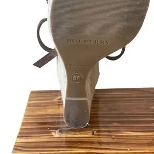 Keywords: Burberry, wedge sandals, espadrille, brown leather, T-strap sandals, size 36, designer shoes, summer sandals, luxury footwear, beach sandals, casual wedges, Italian style, women's shoes