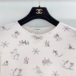 This Chanel long-sleeve top features a pristine white base adorned with intricate ski-themed motifs, including skiers, snowboards, and star-shaped accents, exuding playful charm and vibrant energy. Crafted in a slim-fit silhouette, the knit fabric hugs the body gracefully while the round neckline offers a clean, sophisticated look. Paired with a black hanger featuring the iconic double C logo, it embodies Chanel's refined elegance and fashion-forward taste. This piece seamlessly blends design-forward appeal with everyday wearability.