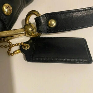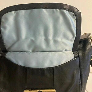 Authentic coach #Ll026-16808 Black leather crossbody handbag with gold tone hardware main compartment 3 pockets at interior wall 1 zip closure & zip closure zip top blue satin fabric lining lining have some stains logo at side snap pocket closure at front scratches at exterior & hardware please check all photos hight 10” width 14” depth 6” Strap drop 10” shoulder strap 28”adjustable Bag dimensions are based on approximate measurements.