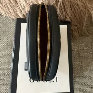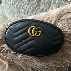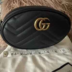 Elevate your style with the Gucci Black Leather Belt Bag. Featuring a sleek design and iconic gold logo, this bag is perfect for any occasion. Selling bag only. No belt included. Some stains inside please refer to pictures. Comes with protective bag and box only. 💯 authentic