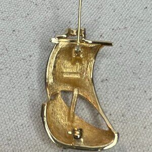 This pin is comprised of a textured, brushed gold and polished hull with a fully-blown sail in topaz gold and clear crystals, all of which are intact. The finding on the back is in perfect working order. A very romantic piece of jewelry!