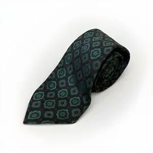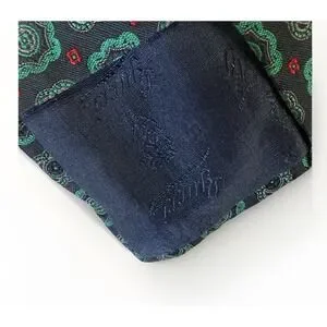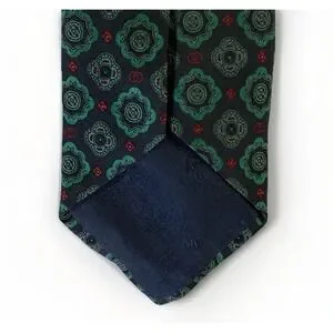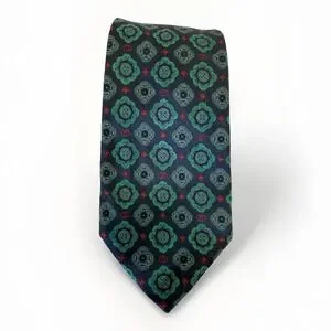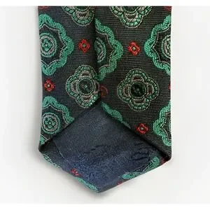 This stunning men's tie features a rich navy base with green and red medallion motifs, woven in luxurious 100% silk.