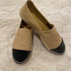 100% authentic Chanel Espadrilles Beige lambskin leather with black cap toe I just got a new pair so only reason I am selling. Please examine all photos closely. These are in like new condition no flaws at all they are super comfortable for walking and I still get compliments every time I wear them. No box or dust bags Size 38 fits true to size 8 Can be worn by a 7.5 with foot pads Please ask any questions / accepting offers!