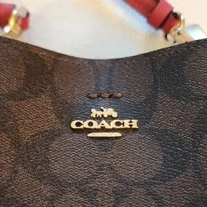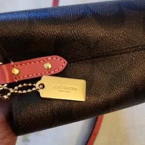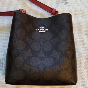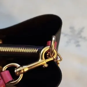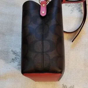 NWOT Elegant Coach crossbody bucket bag. Features a sleek black design with bold pink accents. Perfect for any occasion.