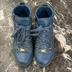 Stylish blue high-top sneakers. Lace-up design with metal accents. Perfect for casual wear. Lovingly worn