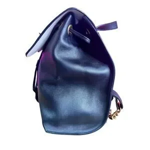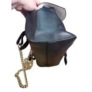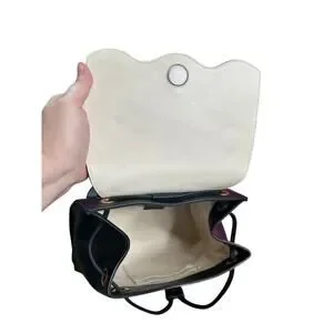 Black, white, gold and multicolor leather Gucci Malin Medium Studded backpack with gold-tone hardware, dual chain-link shoulder straps, flat top handle, logo embellishment at exterior, creme canvas lining, three pockets at interior wall, tie closure at top featuring magnetic closure underneath font flap.