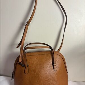 This Gucci shoulder bag in a classic tan color features a structured dome-like shape, perfect for a polished look. Crafted from smooth leather, it offers both top handles and an adjustable shoulder strap for versatile carrying options. Ideal for everyday use, it combines style and functionality effortlessly. Approximate Measurements: 9.5"W x 7"H x 4"D