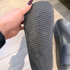 Step into comfort and style with these iconic Balenciaga black rubber slides. Featuring the bold embossed Balenciaga logo across the front strap and a thick platform sole, these slides combine effortless luxury with everyday wearability. ✨ Details: • Brand: Balenciaga • Model: Rubber Platform Slides • Color: Black • Size: EU 37 (fits Women’s 7 / Men’s 5) • Material: 100% molded rubber • Embossed logo on strap & outsole • Lightweight, slip-on comfort • Made in Italy 🇮🇹 📦 Condition: Gently used, excellent overall condition (minimal wear on sole). Clean, stylish, and ready to wear. 🖤 Perfect for streetwear looks, travel, poolside, or casual days out.