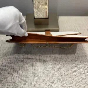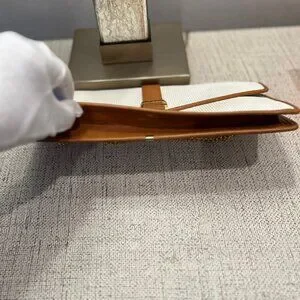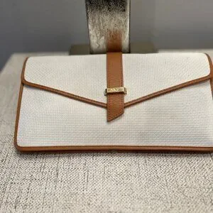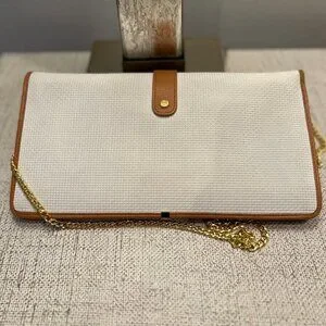 This stylish clutch features a sleek white design with vibrant tan trim is perfect for any occasion. The gold chain strap and gold accents adds a touch of elegance, making it a versatile accessory for day or night.