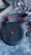 this is a vintage gucci round purse. body is the black coated with tiny black GGs. black piping trim. gold tone hardware.gold tone  GG front logo. top width is narrower than bottom and is 2''. the strap is not adjustable. originally meant for the shoulder but you can cross body. i am 5'4'' and crossing it, it sits at my waist. the exterior is in very nice preowned vintage condition. the interior has visible wear with the black lining peeling off. it will need definite repair...the black comes off on hands. there is a zip pocket with the vintage pull and also the gucci tab