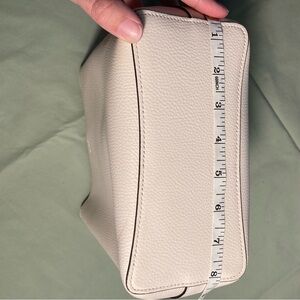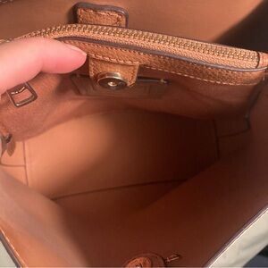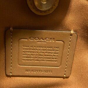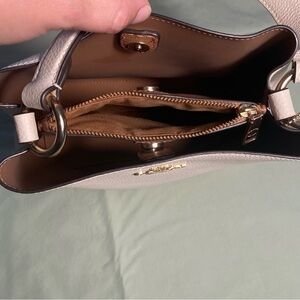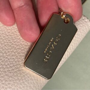 Chic Coach shoulder bag in cream leather. Features gold-tone hardware and signature tag. Perfect for everyday elegance.