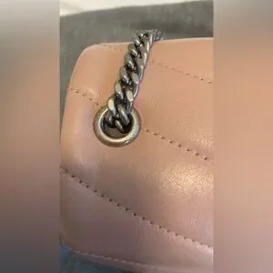 This bag is baby pink with silver hardware, it looks different in some lighting on my photos but it’s baby pink! I placed it on a light grey sweater in some images to pick up the true baby pink color due to poor lighting.