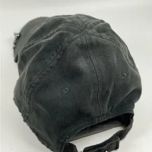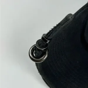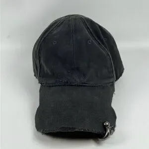 Edgy black streetwear hat with distressed details. Features metal ring accents for a bold grunge look.