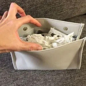 Sturdy, neutral color, medium size very spacious pouches, double magnetic buttons closure. Could be transform on crossbody if you add the chain.