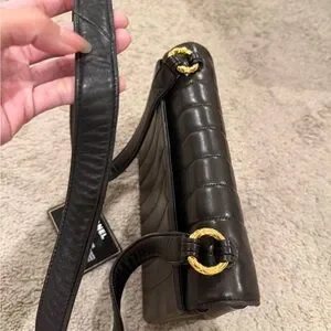 Chic Chanel shoulder bag with vertical quilting. Features iconic gold-tone logo. Stylish and versatile.