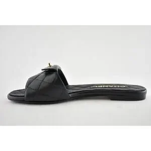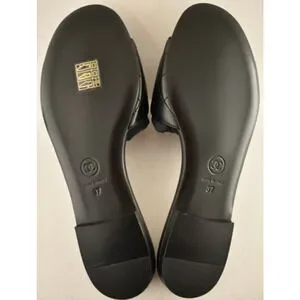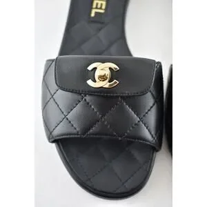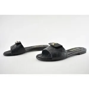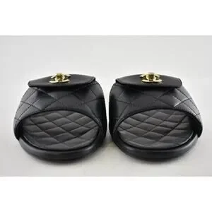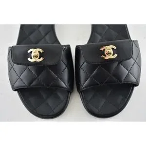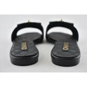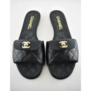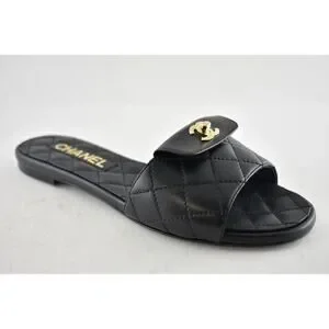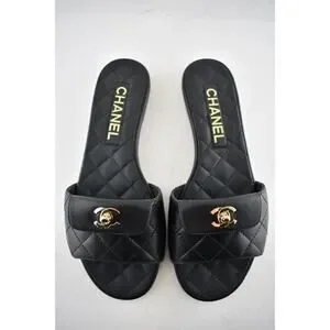 Chanel REV Black Turnlock Quilted Gold CC Logo Mules Slide Sandal Flop Flat 37