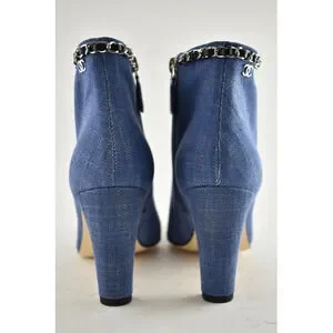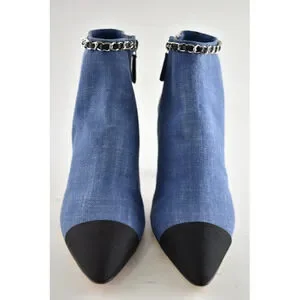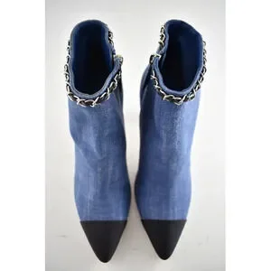 Chanel 20C Blue Denim Fabric Black Chain CC Logo Short Ankle Heel Bootie 38
