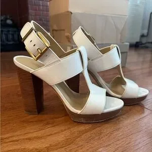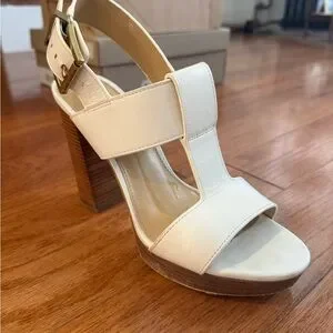Elegant cream sandals with a robust tan block heel. Features a gold buckle for secure fit. Perfect for any occasion.