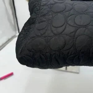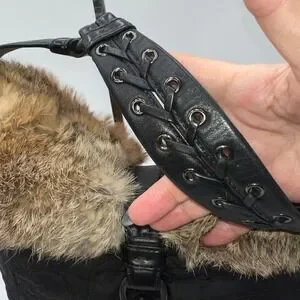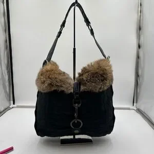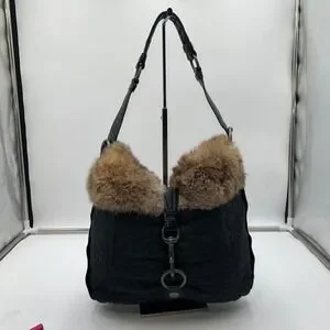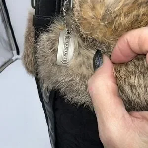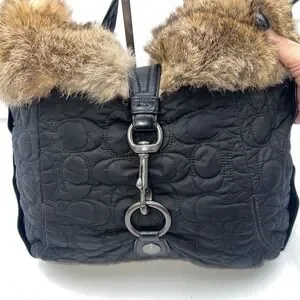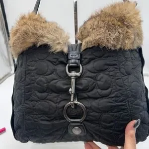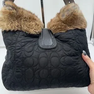 Keywords: Coach handbag, Quilted bag, Fur trim bag, Shoulder bag, Hobo bag, Designer bag, Luxury handbag, Black purse, Winter bag, Fashion accessory, Authentic Coach, Rabbit fur