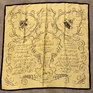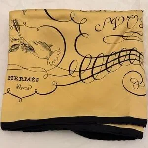 Chic Hermès scarf with artistic script design. Vibrant yellow with bold black accents. 48x48 inches.