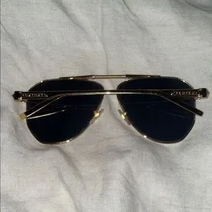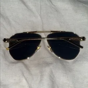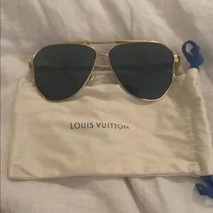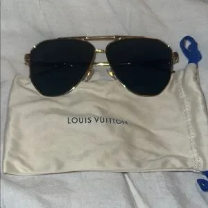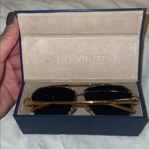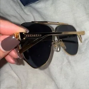 Elegant Louis Vuitton sunglasses with gold frames. Features sleek black lenses. Perfect for a sophisticated look.