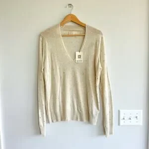 - Features: Embellished, long sleeve, pullover, hand wash, V-neck, ribbed cuffs and hem, comfort, breathable