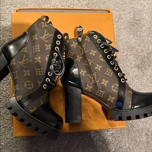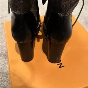 Elegant Louis Vuitton lace-up boots. Features iconic monogram pattern. Stylish black and brown design. Perfect for fashion-forward looks.