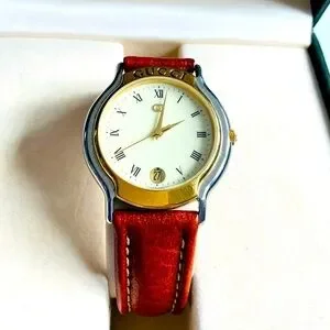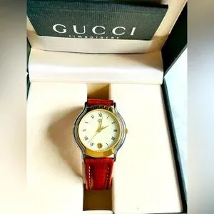 Authentic mens ( also can be worn as unisex) GUCCI watch from two tone stainless steel- all original- with newly replaced battery. Works great, looks nice and dressy, clean dial with Gucci logo mark, date window, comfy leather strap.