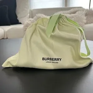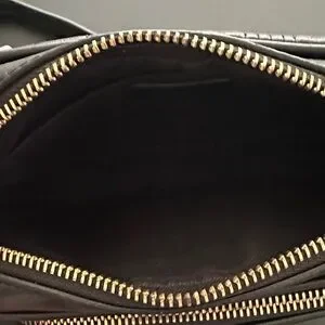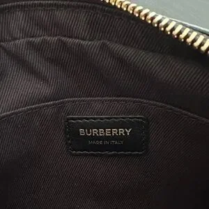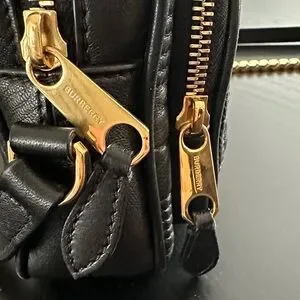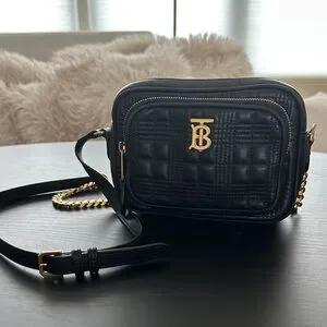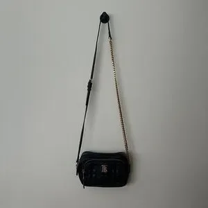 TB Chain-Link Burberry crossbody with quilted design. Black leather with gold-tone hardware. Chain-link shoulder strap. Can panvas lining and single exterior pocket. Dust bag included. Zipper has slight discoloration one area, see photos.