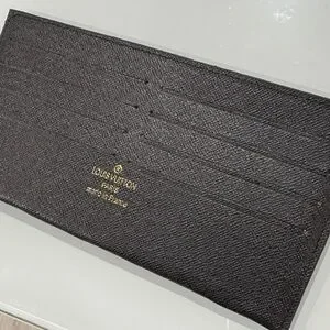 Chic Louis Vuitton card holder. Features sleek black design with gold accents. Ideal for organizing cards up to 8 cards.
