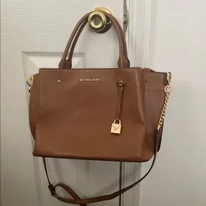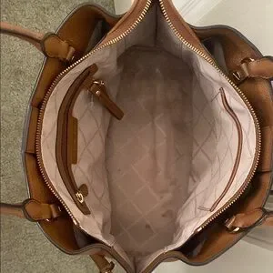Elevate your style with the Michael Kors Brown Leather Tote Bag. This elegant bag features a rich brown color, perfect for any occasion. Crafted with high-quality leather, it offers both durability and sophistication. Ideal for everyday use, this tote combines functionality with a chic design. Has small spots inside (notes in pics). 👜