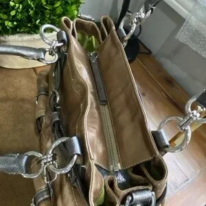 A rare 2008 limited edition from Coach, this extra-large North South tote is a statement piece designed to impress. Crafted in metallic bronze cowhide leather with snake-print trim, it features double handles with loop detailing, bold proportions, and Coach’s signature embossed script across the top. The bright green interior adds a striking pop of contrast, making this bag as functional as it is unforgettable.