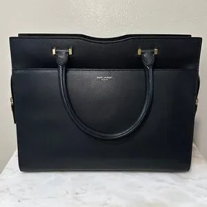 Chic Yves Saint Laurent satchel in pebbled black leather. Features elegant gold logo on removal clutch insert for quiet luxury look.