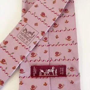 This item is a Hermès 100% silk tie featuring a whimsical snail and butterfly pattern. It is a retired, vintage design and is a popular item among collectors.
