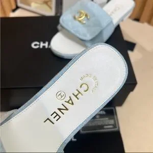 Elegant CHANEL slides in light blue. Perfect blend of comfort and style.